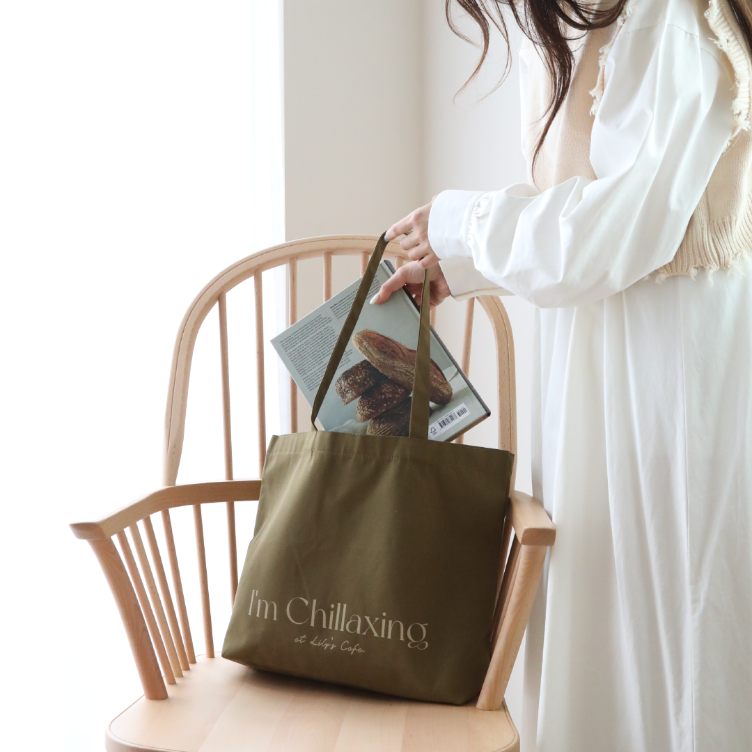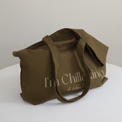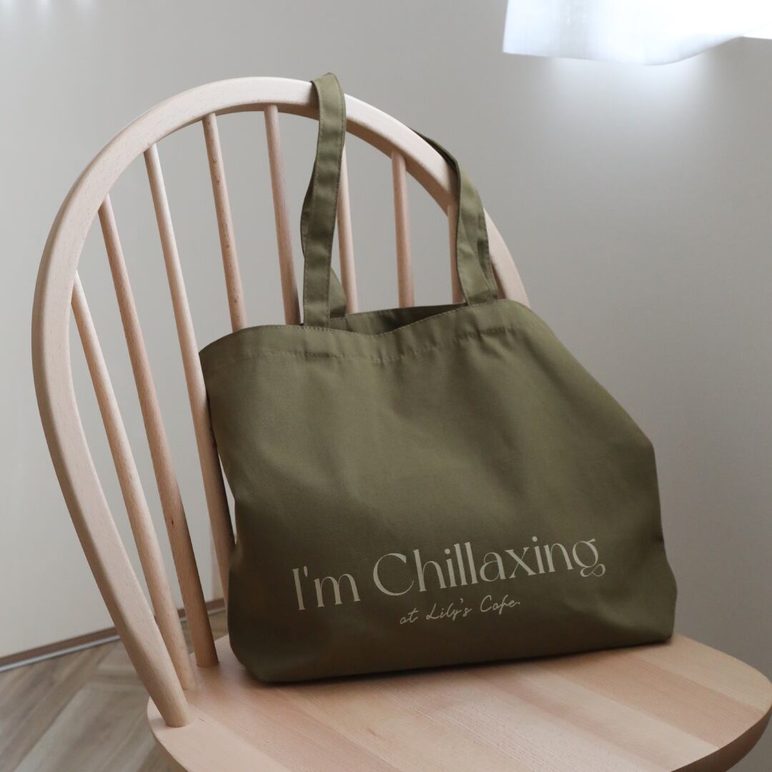 光によってカーキや茶色に見える生地の色に、ベージュで書かれたChillaxingの文字。